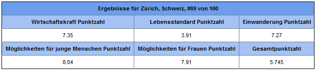 Die folgende Tabelle zeigt eine Auswahl von Ergebnissen für Zürich. Bei allen Ergebnissen stellt 10 die höchstmögliche Punktzahl und 0 die niedrigste dar: