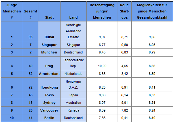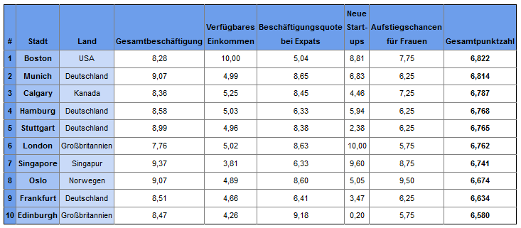 Die nachfolgende Tabelle ist ein Ausschnitt der Ergebnisse und zeigt die Top 10 der besten Städte mit den besten Beschäftigungsmöglichkeiten weltweit: