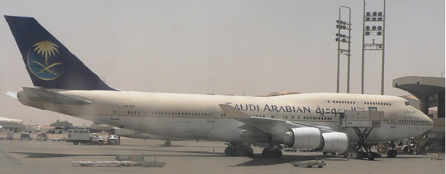 Aufgrund der Strenge in ihrer Heimat (keine Kinos, keine Theater, …) reisen Saudiaraber gerne. Die königliche Saudi Arabian Airlines (im Bild eine Boeing 747) fliegt mit 136 Maschinen zu 80 Flugzielen weltweit, darunter nach Genf.
