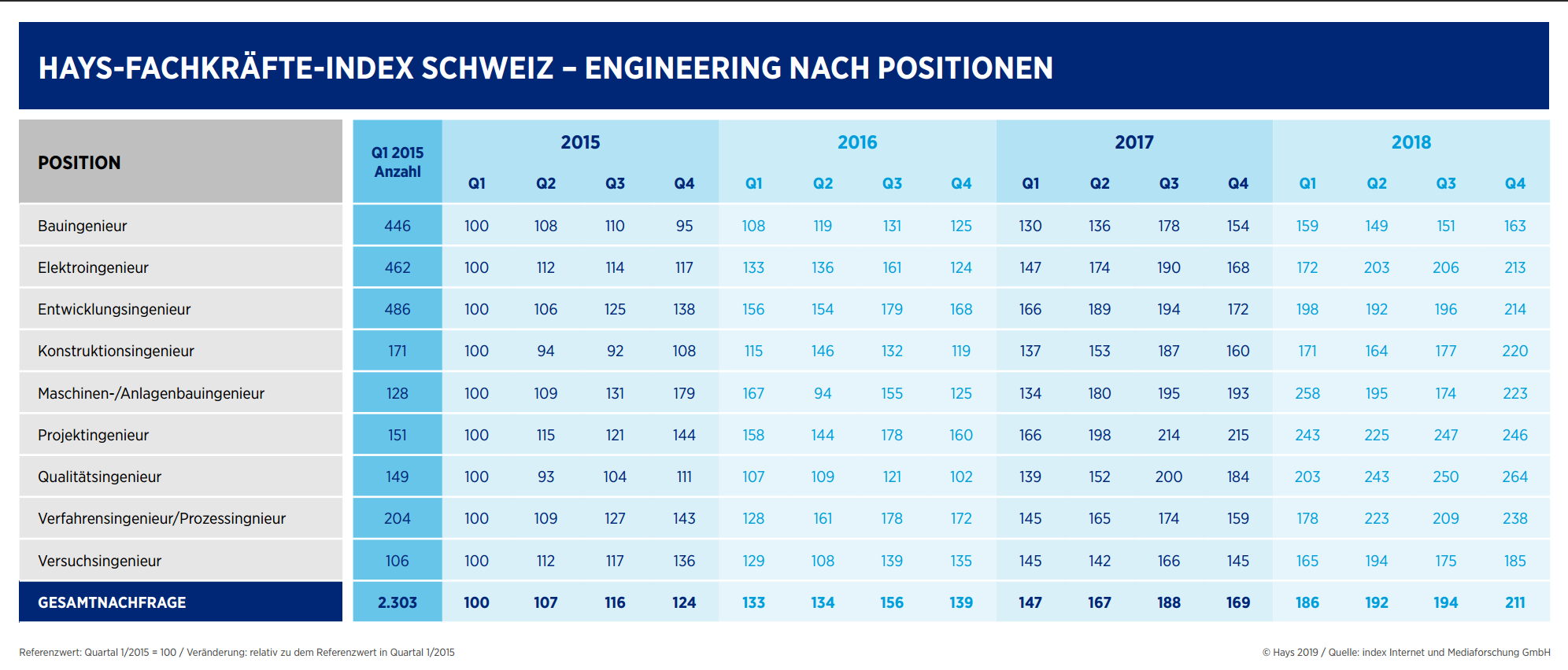 Im Hays-Fachkräfteindex (FKI) lässt sich der oft zitierte Fachkräftemangel beziffern und visualisieren. Der von Hays seit 2011 in der Schweiz etablierte Index basiert auf einer quartalsweisen Auswertung der index Internet und Mediaforschung GmbH für Hays. Einbezogen werden Stellenanzeigen der meistfrequentierten Online-Jobbörsen, von Tageszeitungen sowie dem Business-Netzwerk XING. Der Index erfasst die Stellenausschreibungen im jeweils abgelaufenen Quartal, wobei jede offene Stelle pro Quartal nur einmal gezählt wird, unabhängig davon an wie vielen Stellen sie ausgeschrieben wurde. Zum 1. Quartal 2018 wurde der bisherige Hays-Fachkräfteindex auf eine neue Datenbasis gestellt und um weitere Positionen sowie Branchen erweitert. Den Referenzwert von 100 bildet das 1. Quartal 2015. Zur vereinfachten Lesbarkeit wird bei den Positionsbezeichnungen nur die männliche Form verwendet, auch wenn die Anzeigen sich gleichermassen an Männer und Frauen richten.