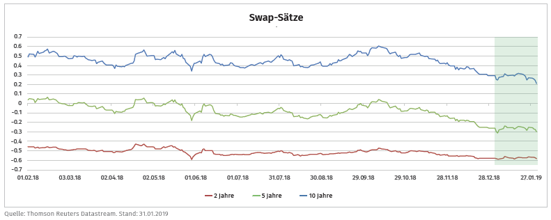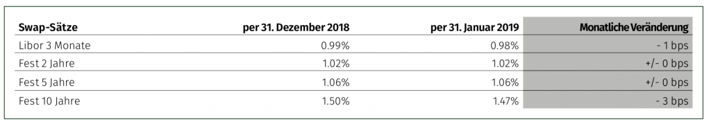 Die tieferen Inflationszahlen der Eurozone führten im Januar zu sinkenden Kreditabsicherungskosten am langen Ende. Der 10-jährige Swap liegt per Ende Januar noch bei 0.21 Prozent und notiert somit 8.5 Basispunkte tiefer als per Ende 2018.