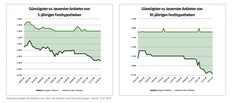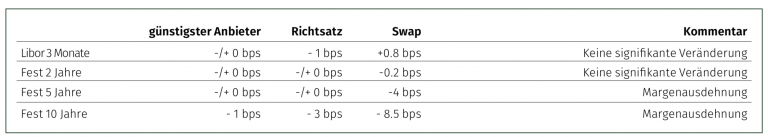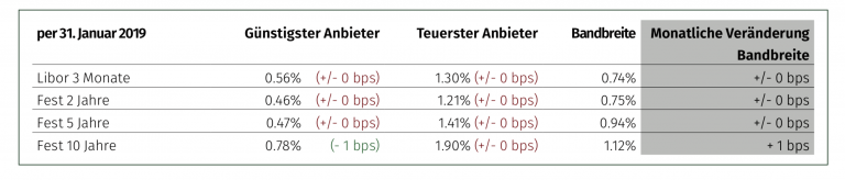 Wie bereits erwähnt brachte der Januar eine durchschnittliche Margenausdehnung von fünf Basispunkten. Der günstigste Anbieter nutzte die Marktentwicklung und dehnte die Marge leicht aus (7.5 Basispunkte). Nichts desto trotz reduzierten sich die Top-Konditionen nochmals leicht um -1 Basispunkt.