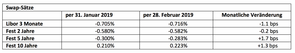 Zürich – Das weltweite Wirtschaftswachstum verlangsamte sich im Februar weiter. Europa bleibt die schwächste der grossen Wirtschaftsregionen, nicht zuletzt, weil Deutschland sich in Richtung Rezession bewegen könnte. Auch in der Schweiz setzte sich im Februar die Abschwächung der Konjunktur fort. Die wirtschaftlichen Unsicherheiten, auch hinsichtlich des Ausgangs des Brexits, sorgen dafür, dass sich die Hypothekarzinsen in der Schweiz weiterhin auf tiefem Niveau befinden und insgesamt am langen Ende nochmals nachgegeben haben.