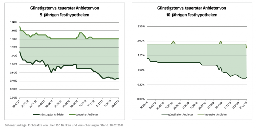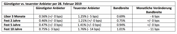 Die Differenz zwischen dem günstigsten und teuersten Anbieter bei den 2- und 5-jährigen Festhypotheken blieb im vergangenen Monat unverändert. Um elf Basispunkte verkleinert hat sie sich hingegen bei den 10-jährigen Laufzeiten und beträgt nun gegenüber 1.12 Prozent im Vormonat noch 1.01 Prozent. Auch sank die Libor-Hypothek des teuersten Anbieters von 1.30 auf 1.25 Prozent, wodurch sich die Differenz um fünf Basispunkte verringerte.