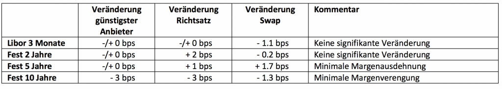 Der Richtsatz für 10-jährige Festhypotheken sank um drei Basispunkte auf 1.44 Prozent, und auch der günstigste Zins für 10-jährige Festhypotheken gab nochmals um drei Basispunkte nach und notiert bei 0.75 Prozent. Dieser Zinssatz für die 10-jährige Festhypothek wird momentan nur von einem unserer Partner angeboten. Dabei handelt es sich um einen Versicherungsanbieter, der weiterhin sehr kompetitiv offeriert. Um sich diesen Zinssatz sichern zu können, werden jedoch gewisse Anforderungen, unter anderem an die Höhe der Belehnung und der Tragbarkeit, gestellt.