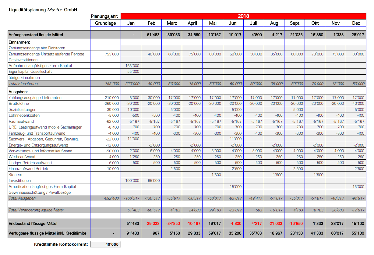Für die Umsetzung gibt es auf dem Markt spezielle Tools. Aber auch einfache und günstige Excellösungen (siehe Beispiel) reichen bei kleineren KMU in den allermeisten Fällen aus. Wichtig und entscheidend ist, dass man einen genauen Überblick über seine Liquidität hat und monatlich einen Soll/Ist-Vergleich erstellt. Weichen die Ist-Zahlen zu stark von den Planzahlen ab, sollte die Planung rollend angepasst werden.