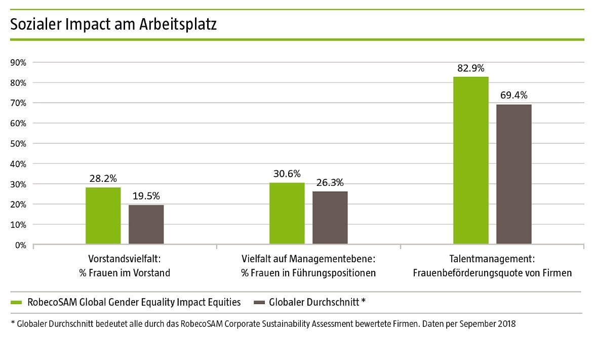 Durch die Auswahl von Unternehmen mit vorbildlichen Praktiken der Gleichberechtigung kann die RobecoSAM Global Gender Equality Impact Equities Strategie potenziell bedeutende Mehrerträge generieren. Als Investor ist RobecoSAM überzeugt, dass Unternehmen, die ihre besten Mitarbeitenden – männliche sowie weibliche – halten können und damit als attraktive Arbeitgeber wahrgenommen werden, Zugang zu einem grösseren Talentpool haben und deshalb mit einer grösseren Wahrscheinlichkeit überdurchschnittliche Wertzuwächse erzielen können. (RobecoSAM/mc/ps)