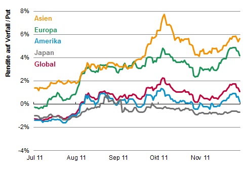 Wandelanleihen haben den Vorzug, dank der integrierten Option an steigenden Aktienkursen zu partizipieren. Entwickeln sich die Märkte nicht wie erwünscht nach oben, wird die Wandelanleihe nicht in Aktien gewandelt sondern spätestens beim Fälligkeitsdatum zurückbezahlt. Während der Laufzeit bezahlen die meisten Wandelanleihen zudem eine stabile Renditekomponente in Form eines Coupons – unabhängig von der Aktienkursentwicklung. Im ML Global Convertible G300 Index (globaler Wandler Index von BofA Merrill Lynch) beträgt der Durchschnitt der Coupons rund 2,8%. Die Rendite auf Verfall beträgt im Moment rund 1% bei einem durchschnittlichen Rating im Bereich der Anlagequalität (BBB). Wer im Bereich der Wandler auf der Jagd nach Verfallsrendite ist, sollte unbedingt einen Blick in die regionale Verteilung werfen. Während Wandler in Amerika und Japan eher weniger Rendite auf Verfall offerieren, sind in den Regionen Europa und speziell Asien ex Japan gute Gelegenheiten zu finden.
