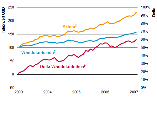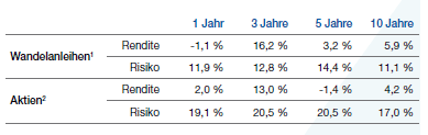 Vor diesem Hintergrund wird die richtige Risikoakzentuierung in den verschiedenen Anlageklassen im nächsten Jahr keine einfache Aufgabe werden. Gerade in Zeiten von unsicheren Prognosen, unklaren Trends und hoher Volatilität hat sich in der Vergangenheit eine Anlage in Wandelanleihen gelohnt. Denn einer der Vorzüge von Wandelanleihen ist die überproportionale Teilnahme an steigenden Aktienmärkten im Vergleich zu sinkenden. Im mittel- bis langfristigen Durchschnitt ergibt diese Konvexität der Wandelanleihen die Eigenschaft aktienähnlicher Renditen mit deutlich tieferer Volatilität.