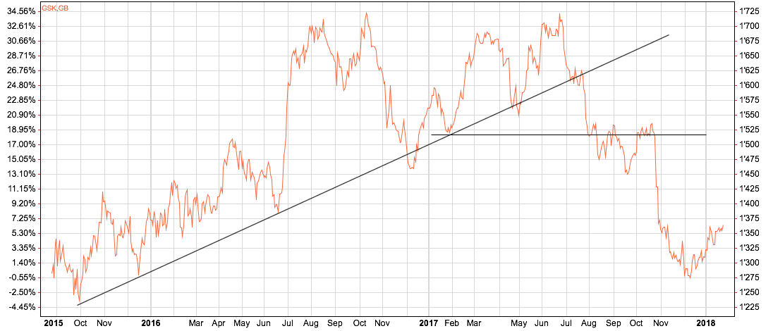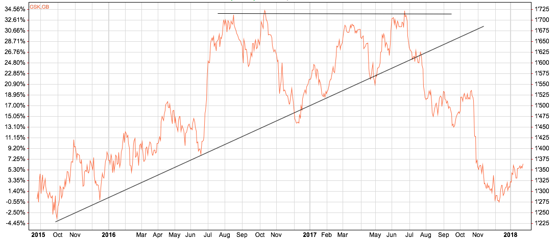Anfang 2017 hat der Aktienkurs des Pharmariesen GlaxoSmithKline ein Zwischentief um 1500p markiert. Danach folgte eine Kurserholung bis ca. 1720p. Von diesem Kursniveau her begann die Aktie zu fallen. Bereits im Laufe Juli 2017 war die steigende Trendlinie um 1630p gebrochen, was bereits ein erstes Zeichen für den Verkauf der Aktie darstellte. Allerdings erreichte die Aktie zwischen August und November gut dreimal das alte Tief um 1500p. Dies hätte für einen Seitwärtstrend sprechen können und damit für zumindest ein Halten der Aktienposition für hartnäckige Anleger, die an der Aktie von GlaxoSmithKline festhalten wollten trotz des Bruchs der Trendlinie bei ca. 1630p. Als dann der Aktienkurs diese starke Unterstützungszone um die 1500p im November nach unten durchbrochen hatte, haben wir ein zweites starkes Verkaufssignal erhalten. Spätestens dann hätten wir also als hartnäckige Anleger idealerweise die Aktie um die 1500p verkaufen sollen.