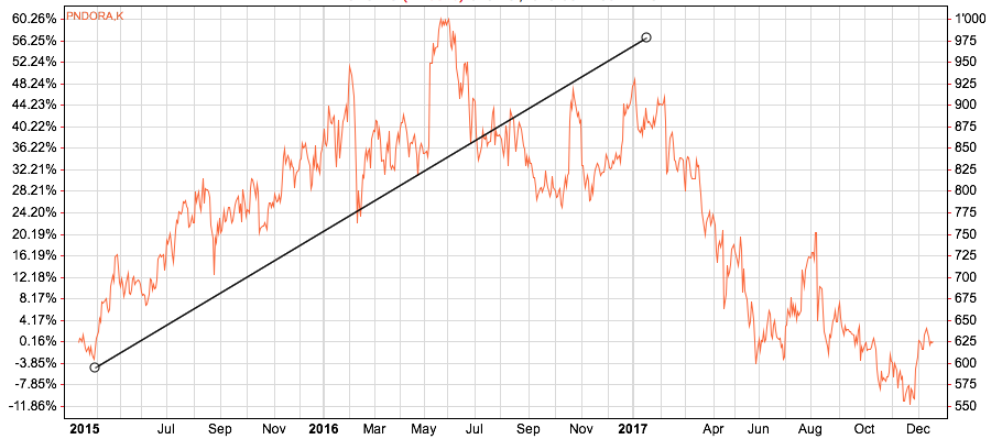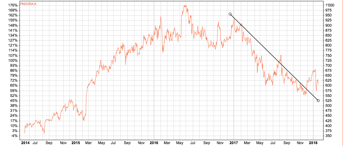 Solange sich der Aktienkurs einer Aktie oder eines Aktienindexes auf der Trendlinie hält, besteht charttechnisch gesehen kein Grund um aus der Aktienposition auszusteigen. Die Zwischentiefs sollen die Trendlinie nicht nachhaltig unterschreiten. Als Beispiel: Beim Luxusgüterkonzern Pandora sah alles gut aus bis August 2016, als der Aktienkurs – wie in der Chart ersichtlich –, unter die Trendlinie gefallen war. Es gab zwar eine Erholung spät im 2016, allerdings konnte der Aktienkurs nicht mehr über die Trendlinie steigen: ein klassisches Beispiel eines Bruchs der Trendlinie. Und damit war der ideale Ausstieg aus der Aktie im Sommer 2016.