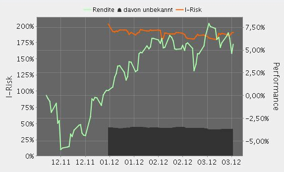 Nicht bei jedem Portfolio kann das I-Risk exakt berechnet werden. Zu vereinzelten Wertpapieren werden zum Beispiel keine Risikokennzahlen geliefert. Die Berechnungsgrundlage ist jeweils 100 %. Fehlt bei einer Position die Berechnungsgrundlage, wird der entsprechende Anteil in der Grafik schwarz hinterlegt. Wenn keine einzige Position berechenbar ist, ist der gesamte Hintergrund 100 % schwarz hinterlegt. Das I-Risk ist dann aussagekräftig, wenn es zu 100 % berechenbar ist.