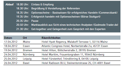 So veranstaltet die Commerzbank zusammen mit der Börse Stuttgart und dem Onlineportal für technische Analyse Godmode-Trader.de eine Seminar-Tour zum Thema Optionsscheine. In fünf Städten Deutschlands sowie in Basel erfahren Seminarteilnehmer alles über die Funktionsweise und den Handel der beliebten Hebelprodukte. Des Weiteren soll ein Exkurs in die technische Analyse einen aktuellen Überblick über die Situation an den internationalen Finanzmärkten geben sowie die Suche nach dem idealen Basiswert und dem richtigen Einstiegszeitpunkt erleichtern.