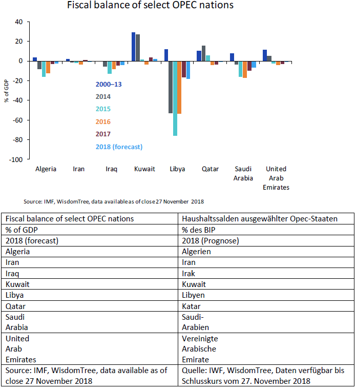 Der Zusammenbruch der Ölpreise, der in der zweiten Jahreshälfte 2014 seinen Anfang nahm, schadete den Haushaltssalden der Opec-Mitgliedsstaaten, deren Regierungen von den Erdölerträgen in hohem Mass finanziell abhängig sind. Trotz der Sparmassnahmen in den folgenden Jahren kam es erst zu einer deutlichen Entspannung im Haushalt dieser Länder, als sich die Ölpreise 2017 wieder erholten.
