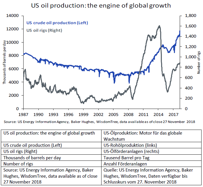 In den USA wird die Ölproduktion mit hoher Geschwindigkeit ausgeweitet, was eine Senkung der weltweiten Ölpreise zur Folge hat. Obwohl durch den Preisrückgang von 2014 auch die Anzahl der Ölförderanlagen sank, führte der Fokus auf Kostenkontrolle und Effizienzsteigerung bei den Förderanlagen 2016 wieder zu einer Produktionsausweitung. Die USA produzieren mehr Öl denn je und sind heute der grösste Rohölproduzent der Welt. Im Vergleich zum Spitzenwert von 2014, wurde dies mit 45 % weniger Förderanlagen erreicht.