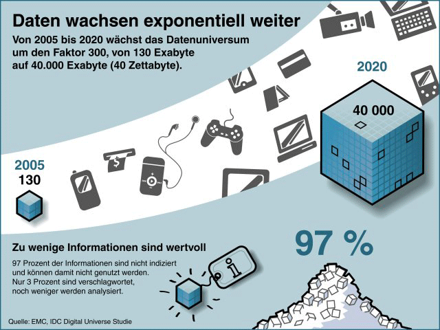 Die Ursachen für das Datenwachstum sind der weltweite Siegeszug der PCs und Smartphones, eine stark wachsende Internetnutzung in den Schwellenländern und die zunehmende Verbreitung vernetzter Geräte wie z. B. Überwachungskameras und intelligente Stromzähler. Diese Entwicklung hat dazu geführt, dass sich das digitale Universum in den letzten zwei Jahren auf unvorstellbare 2,8 Zettabyte verdoppelt hat. In nur acht Jahren soll das digitale Universum auf 40 Zettabyte anwachsen, prognostiziert IDC. Ein Zettabyte sind 1.000.000.000.000.000.000.000 Byte – eine Zahl mit 21 Nullen. Zum Vergleich: Es gibt 700.500.000.000.000.000.000 Sandkörner auf allen Stränden auf der Erde (oder siebenhundert Trillionen fünfhundert Billiarden). 40 Zettabyte entsprechen 57 Mal der Menge der Sandkörner auf allen Stränden der Erde. Oder anders betrachtet: Im Jahr 2020 wird jeder Mensch im Schnitt jährlich etwa 5.247 Gigabyte zum digitalen Universum beitragen.