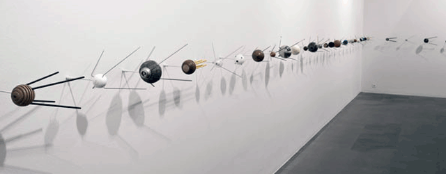 Die im Mittelpunkt stehende Sputnik-Installation befasst sich mit dem Thema Skulptur – damit und mit anderen eigens angefertigten Werken schlägt Ondák eine Brücke zu den Plastiken von Alberto Giacometti, die in unmittelbarer Nachbarschaft seiner Ausstellung zu sehen sind. Insgesamt 96 kleine Sputniks wurden für den Kabinettraum geschaffen. An den Wänden rundum verteilt, erwecken sie die Illusion, hier befände sich Sputnik im Weltall und der Betrachter mittendrin. 96 Minuten brauchte Satellit Sputnik für eine Erdumdrehung. Zeit, Reisen und Zeitreisen sind wiederkehrende Themen in Roman Ondáks Werk, durch das Kuratorin Mirjam Varadinis das kunst- wie zeitgeschichtlich interessierte Publikum zu leiten vermag. (kh/mc/th)