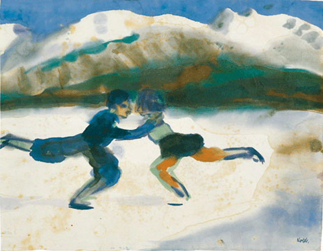 Schlittschuhläufer auf Bergsee, (Paarlauf), Ohne Jahr, Aquarell, 35 x 44.8 cm, Nolde Stiftung Seebüll