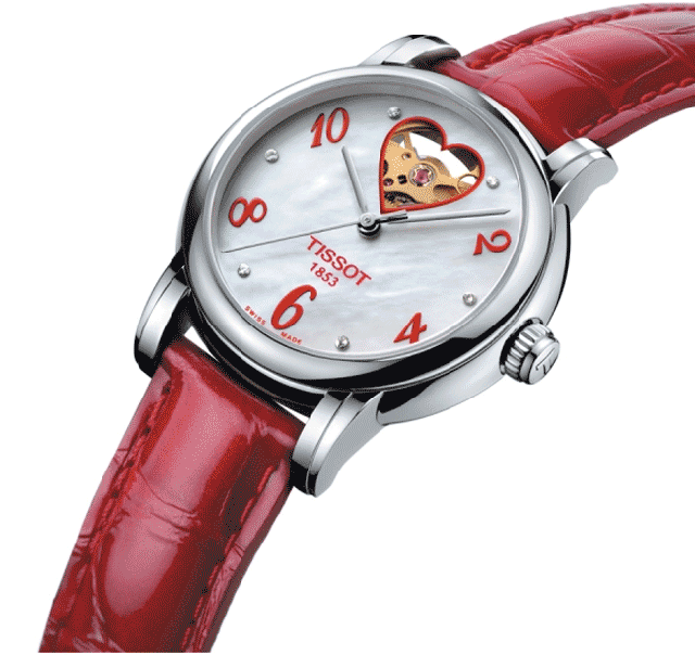 Die marke Tissot steht für Langlebigkeit und es könnte ja sein, dass etwas davon auch in ihrem Geschenk mitgemeint ist, denn damit wird «Lady Heart» das perfekte Valentinsgeschenk aus Perlmutt und Edelstein. Die riesigen roten Ziffern scheinen fröhlich auf dem Perlmuttgrund herumzukullern, gerade so als würden nur die fröhlichen Stunden gezählt. Das Armband ist aus fein gestepptem Leder mit Krokodil-Prägung und einer klassischen Faltschliesse – beide sind in feurigem Rot gehalten.